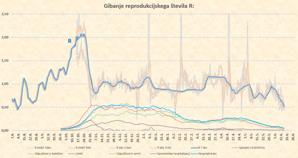 Mogoče nam jutri R še pokaže okoli 0.47, potem pa pričakujem vrnitev nazaj tik nad 0.50 – tako namreč kažejo vremenski pogoji (glej graf zunanih vplivov), pa tudi praznik 25.6. bo v soboto izpadel iz medtedenskih primerjav.