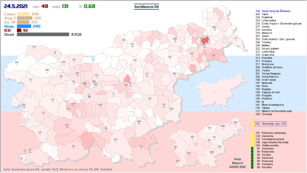 3 rumene regije, 8 oranžnih, 1 rdeča – imeli smo padec 7d povprečja zaradi praznika 27.4.