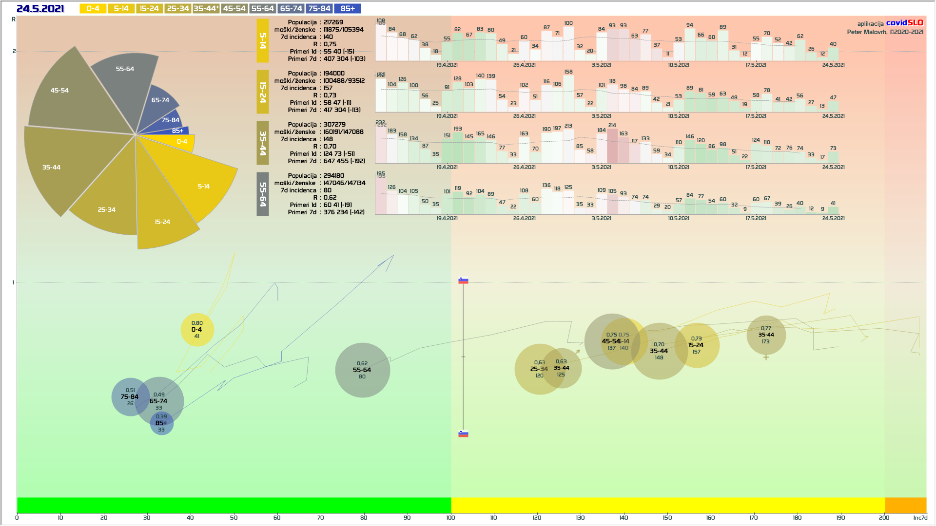 Logika mini-lockdown-a: Zelo verjetno so bile prvomajske počitnice naš naslednji mini-lockdown. Z zamikom nekaj dni imamo padanje, kot smo ga imeli po 11.4. Po analogiji bi lahko pričakovali, da se nam zdaj R prične dvigovati nazaj tam nekje na 0.95. Preko 1 ne zaradi kar visokga tempa cepljenja. V tej isti smeri delujejo tudi vsa zadnja sproščanja, ki bi to lahko še malo dvignila. V nasprotni smeri pa delujejo vremenske razmere in seveda intenzivno cepljenje (tudi 100k/teden). Se pravi, dvig R nazaj na 0.95 ne bi smel biti nobeno presenečenje. Bi pa to seveda pomenilo, da v maju še ne bomo v zeleni fazi …