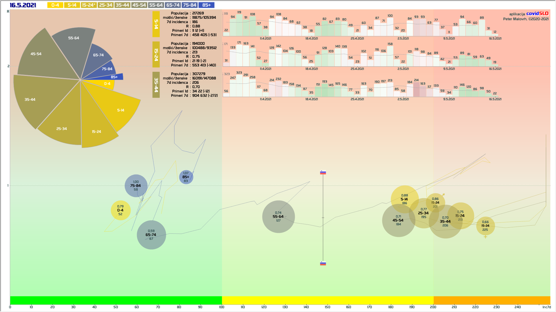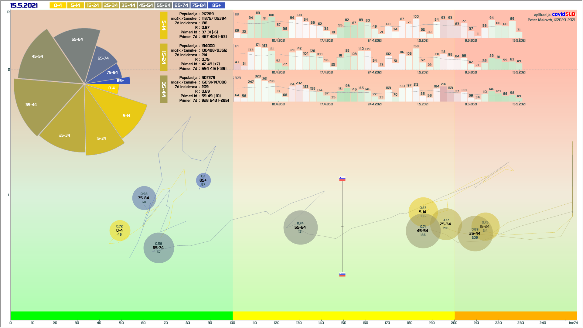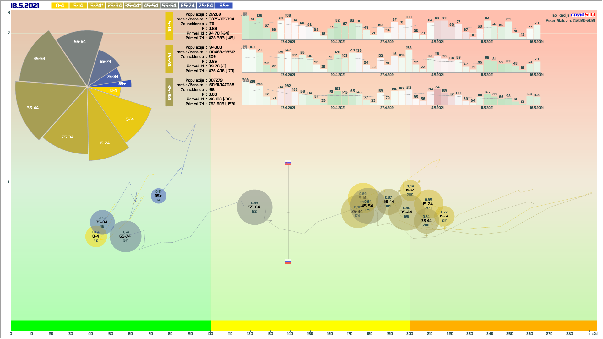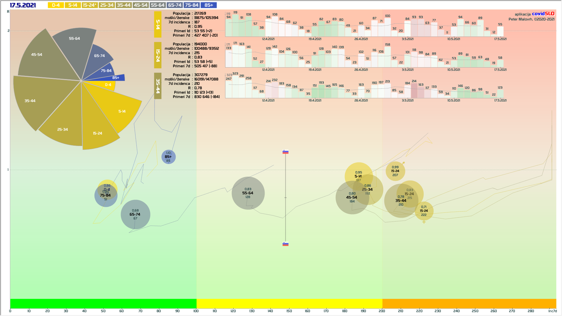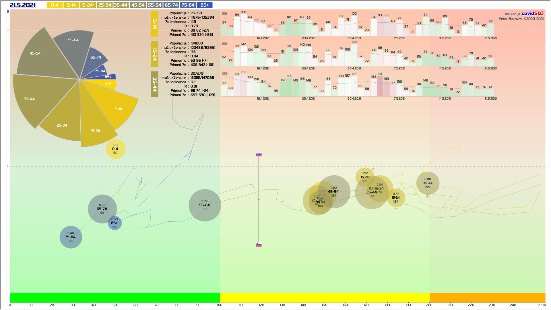 Logika mini-lockdown-a: Zelo verjetno so bile prvomajske počitnice naš naslednji mini-lockdown. Z zamikom nekaj dni imamo padanje, kot smo ga imeli po 11.4. Po analogiji bi lahko pričakovali, da se nam zdaj R prične dvigovati nazaj tam nekje na 0.95. Preko 1 ne zaradi kar visokga tempa cepljenja. V tej isti smeri delujejo tudi vsa zadnja sproščanja, ki bi to lahko še malo dvignila. V nasprotni smeri pa delujejo vremenske razmere in seveda intenzivno cepljenje (tudi 100k/teden). Se pravi, dvig R nazaj na 0.95 ne bi smel biti nobeno presenečenje. Bi pa to seveda pomenilo, da v maju še ne bomo v zeleni fazi …