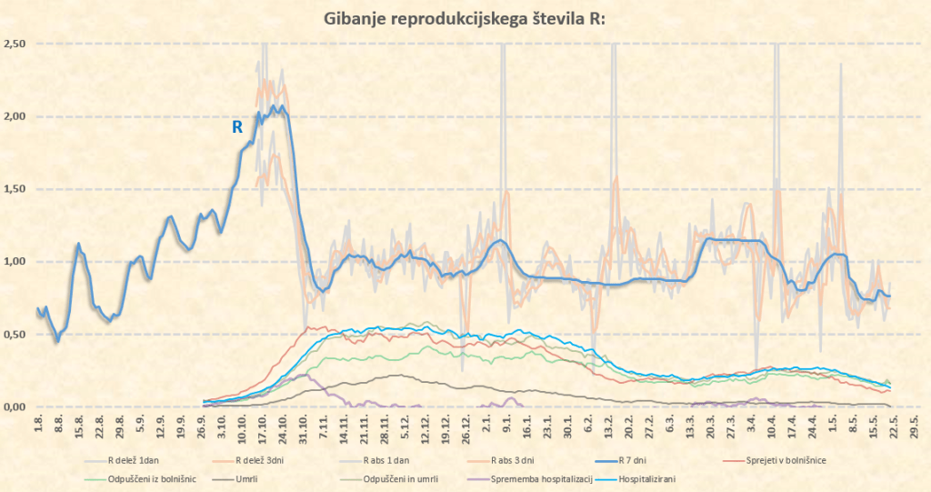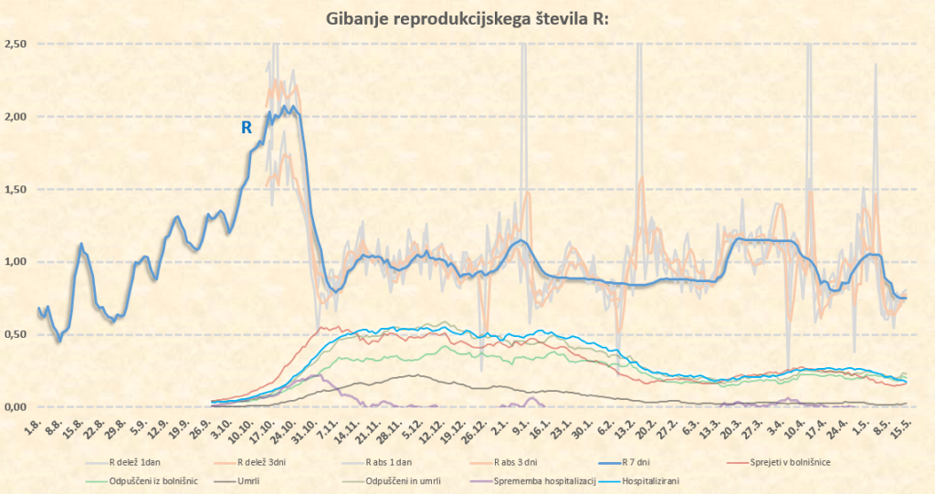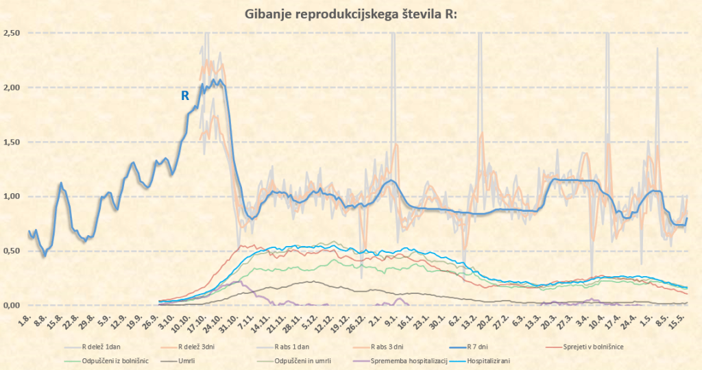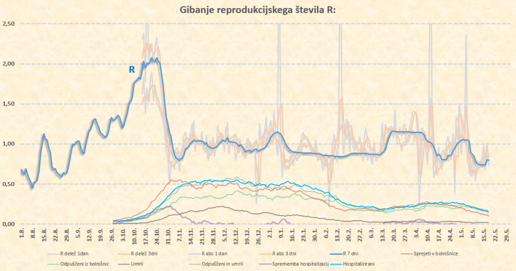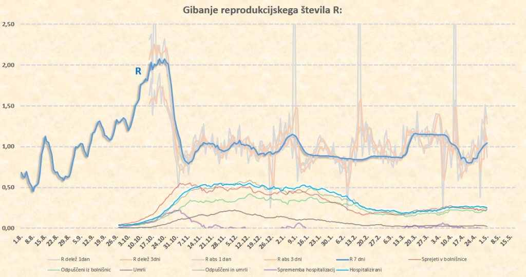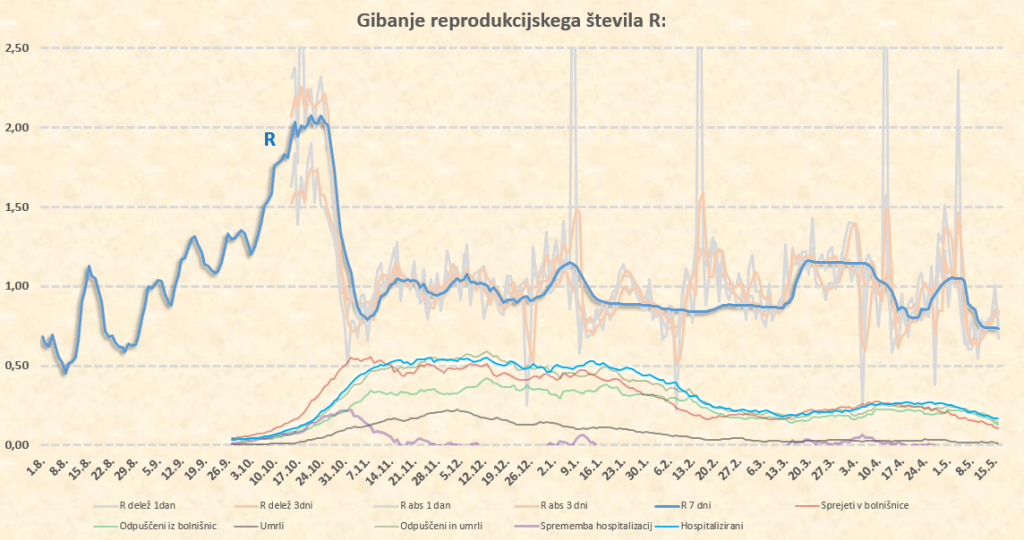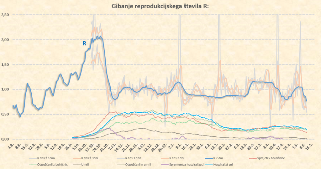 R se bo zdaj za nekaj dni verjetno ustalil na nivoju tik pod 0.7, po 17.5. pa zaradi temperature, vlage in sončnega obsevanja verjetno sledi padec na 0.6. Morda pa je to malce preotimistično, saj trenutno res konkretno sproščamo ukrepe – bomo videli.