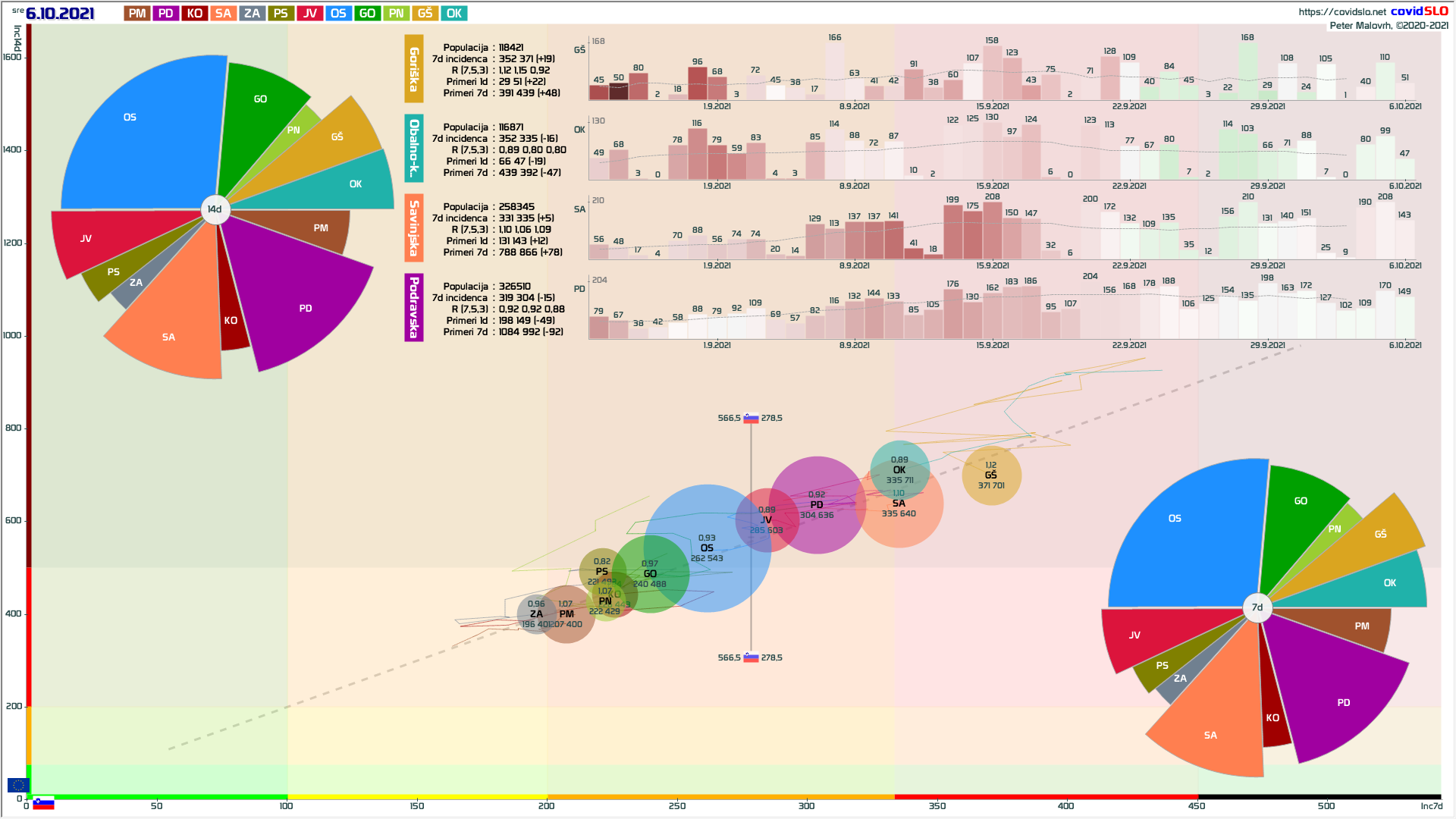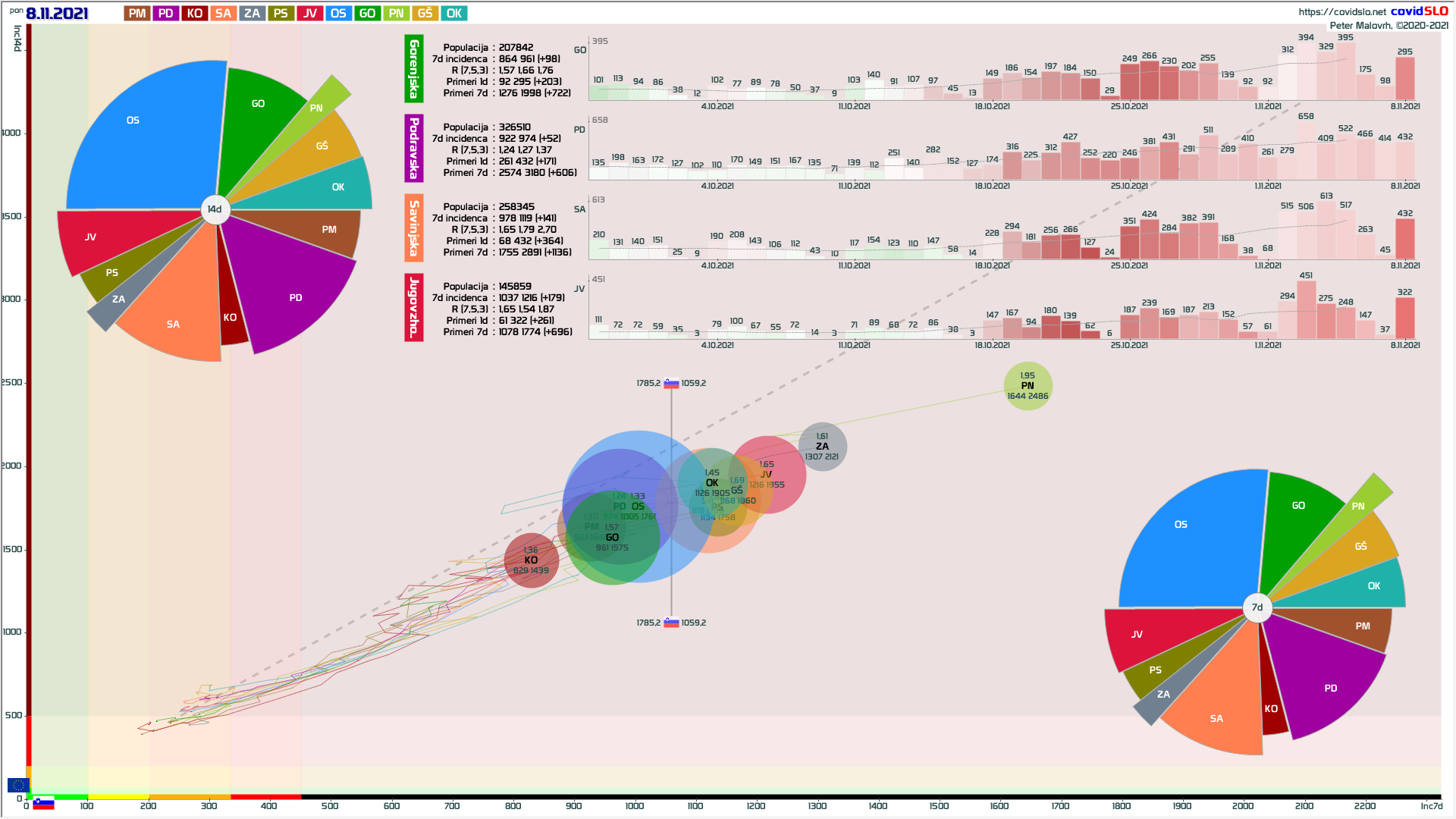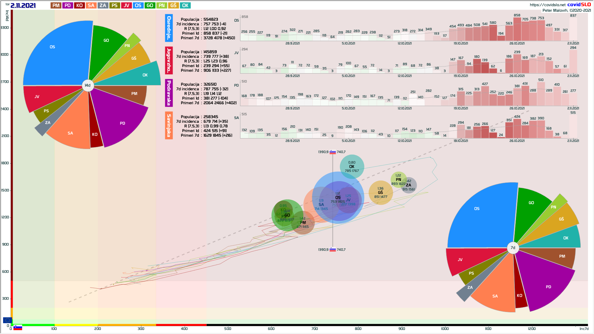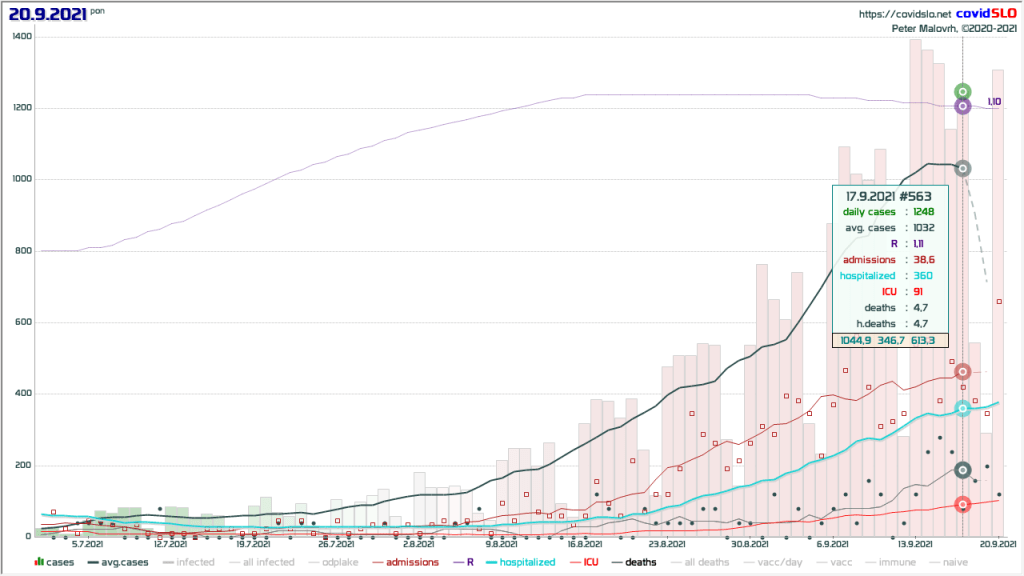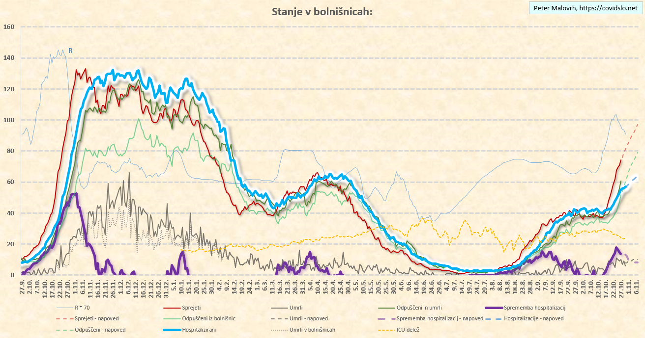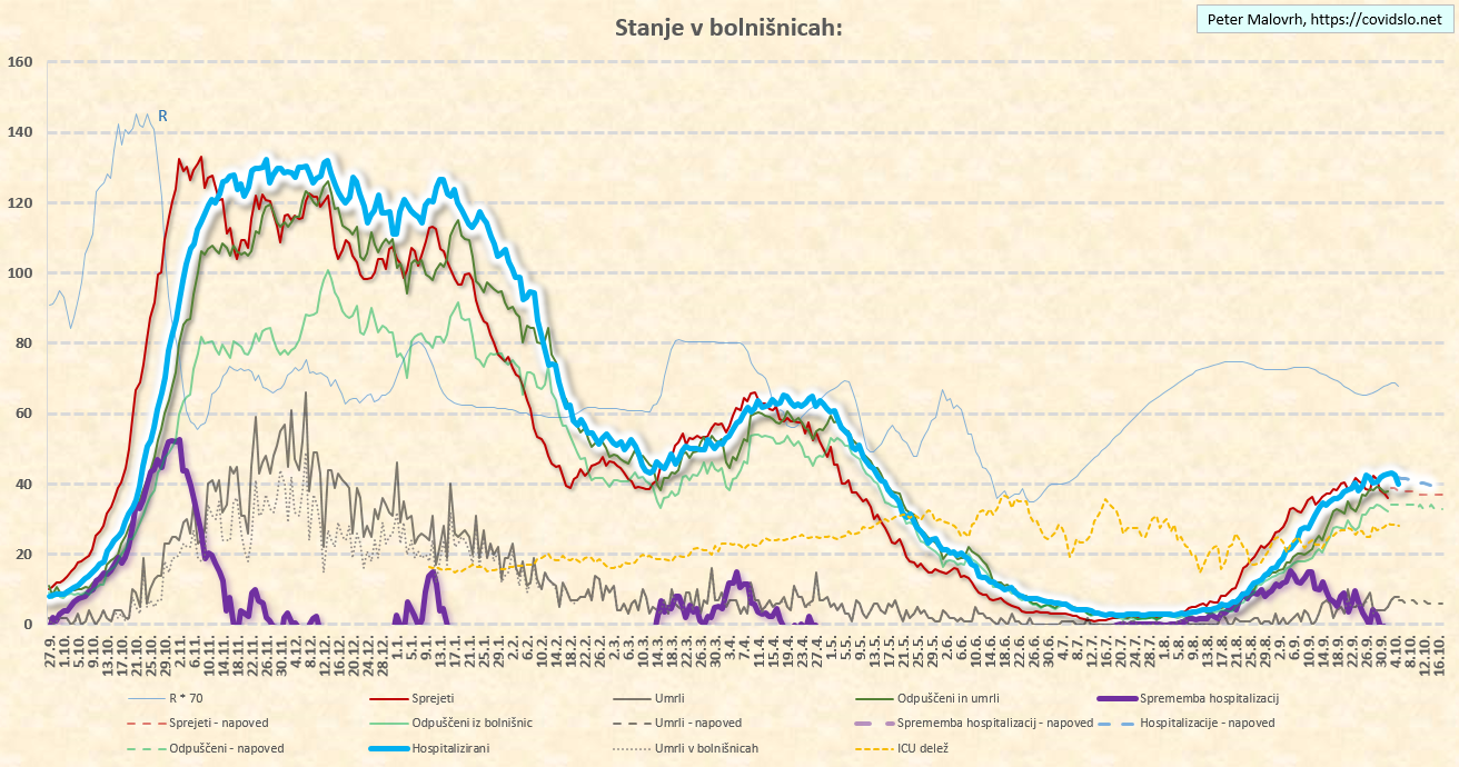 število novih sprejemov v bolnišnice (zdaj umirjeno) narašča, trenutno povprečno okoli 43/dan, smrti je okoli 5/dan in se počasi dviguje
