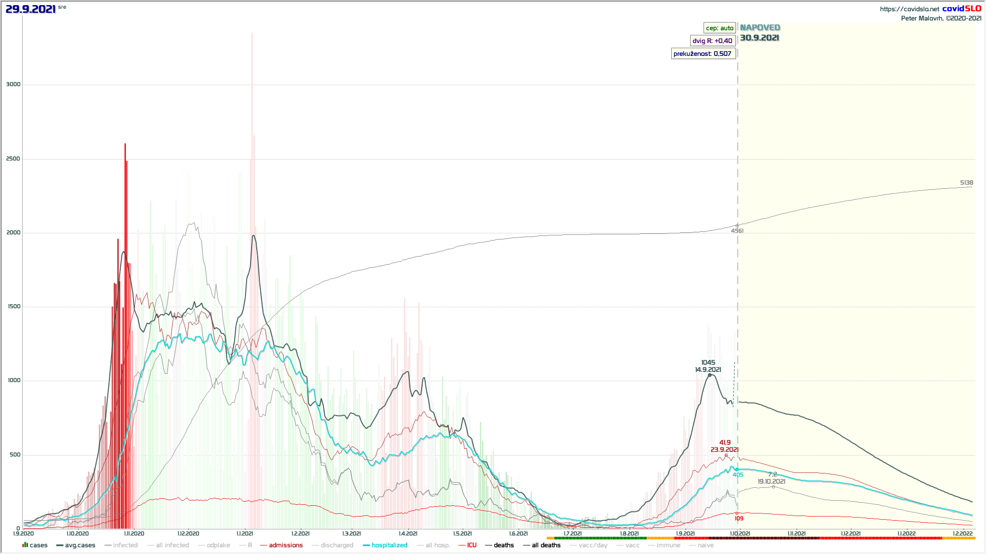 Rezultati epidemiološkega modela, ki se nahaja v aplikaciji covidSLO, so na grafu spodaj, in prikazuje 7d tekoče povprečje števila novih primerov, kumulativo vseh dejanskih okužb (zaznane s testi in tudi nezaznane), sprejeme v bolnišnice, gibanje R, števila hospitaliziranih ter v intenzivnih enotah, dinamiko cepljenja, imune in neimune. Upošteva se zmanjševanje neimune 50+ populacije, kar privede do nižjega vrha sprejemov, prejšnjega vrha sprejemov in lomljene padajoče krivulje sprejemov. Omogočeno je ročno nastavljanje treh parametrov: tempo cepljenja, jesenski dvig R ter privat nastavitev dosedanje prekuženosti. Vrh dogajanja se kaže proti koncu oktobra, ker se število neimunih prej očitno ne bo dovolj zmanjšalo.
