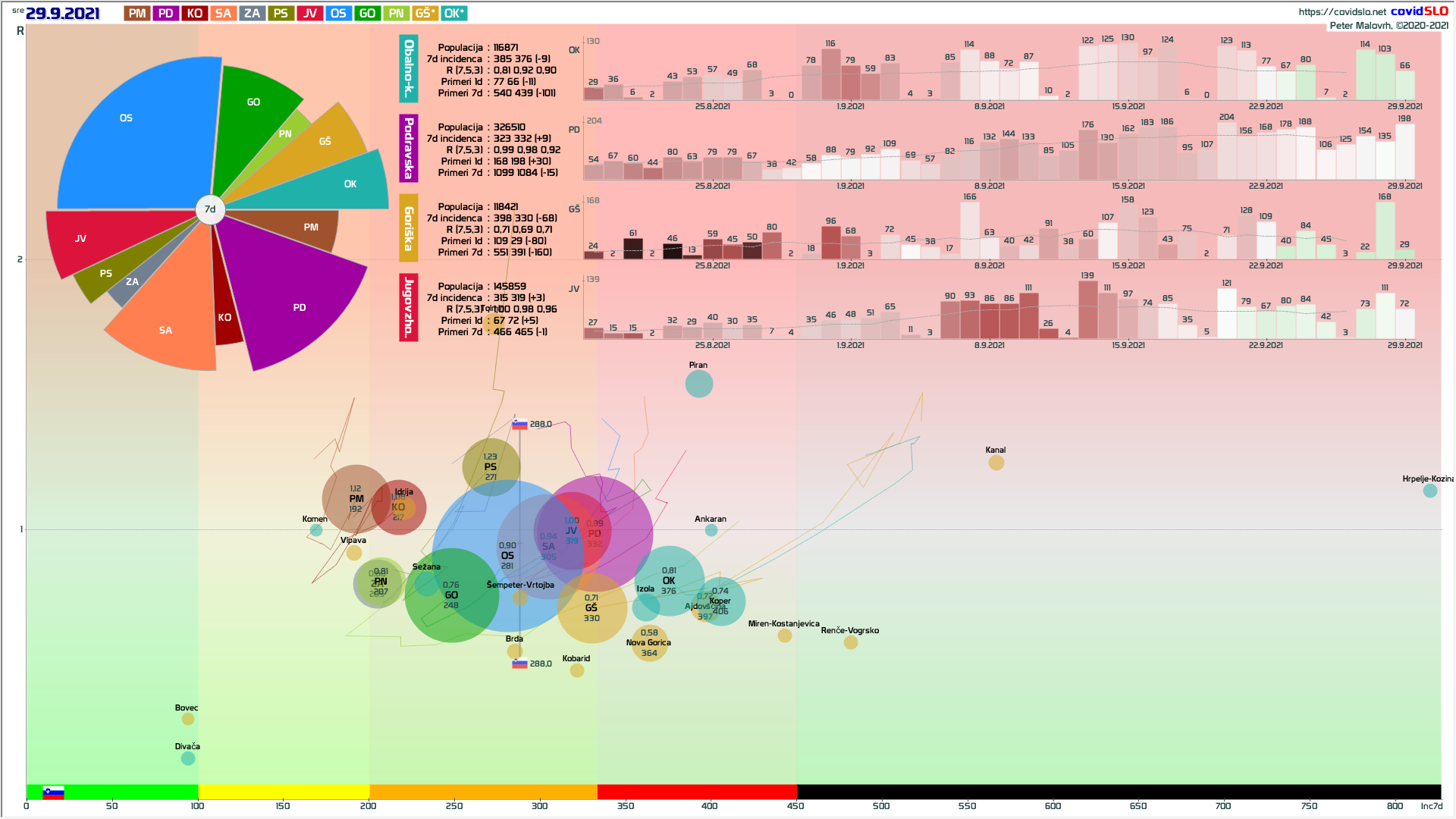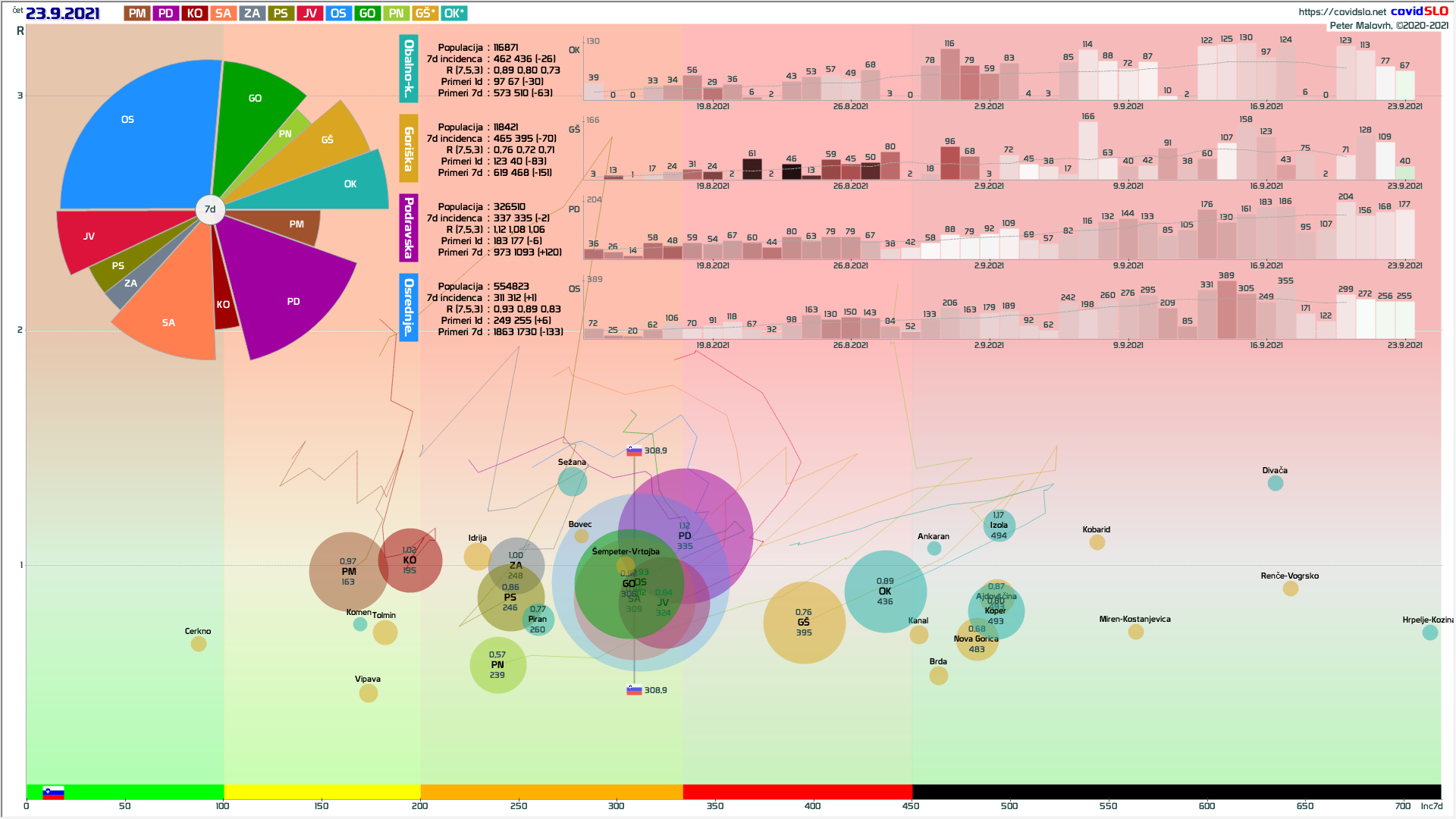 Ocenjujem (za teden dni nazaj) R=1.22 Proces povečevanja R zaradi delte je že nekaj časa končan. Zdaj ga višajo službe in šole, malenkost tudi vreme (pri delti ima vreme zelo majhen vpliv). Učenci se bolj testirajo, zato zdaj vse bolj normalna incidenca v skupini 5-14 let, ki je bila prej nerealno nizka zaradi netestiranja. Izračunani R je tako sredi septembra vleklo previsoko, zdaj pa ga bo nekaj časa prenizko. Pravi R je vrjetno nekje med 1.15 in 1.25. , pokazal se bo po 25.9. Vpliv šol bo na številke še veliko bolj opazen po 25.9.