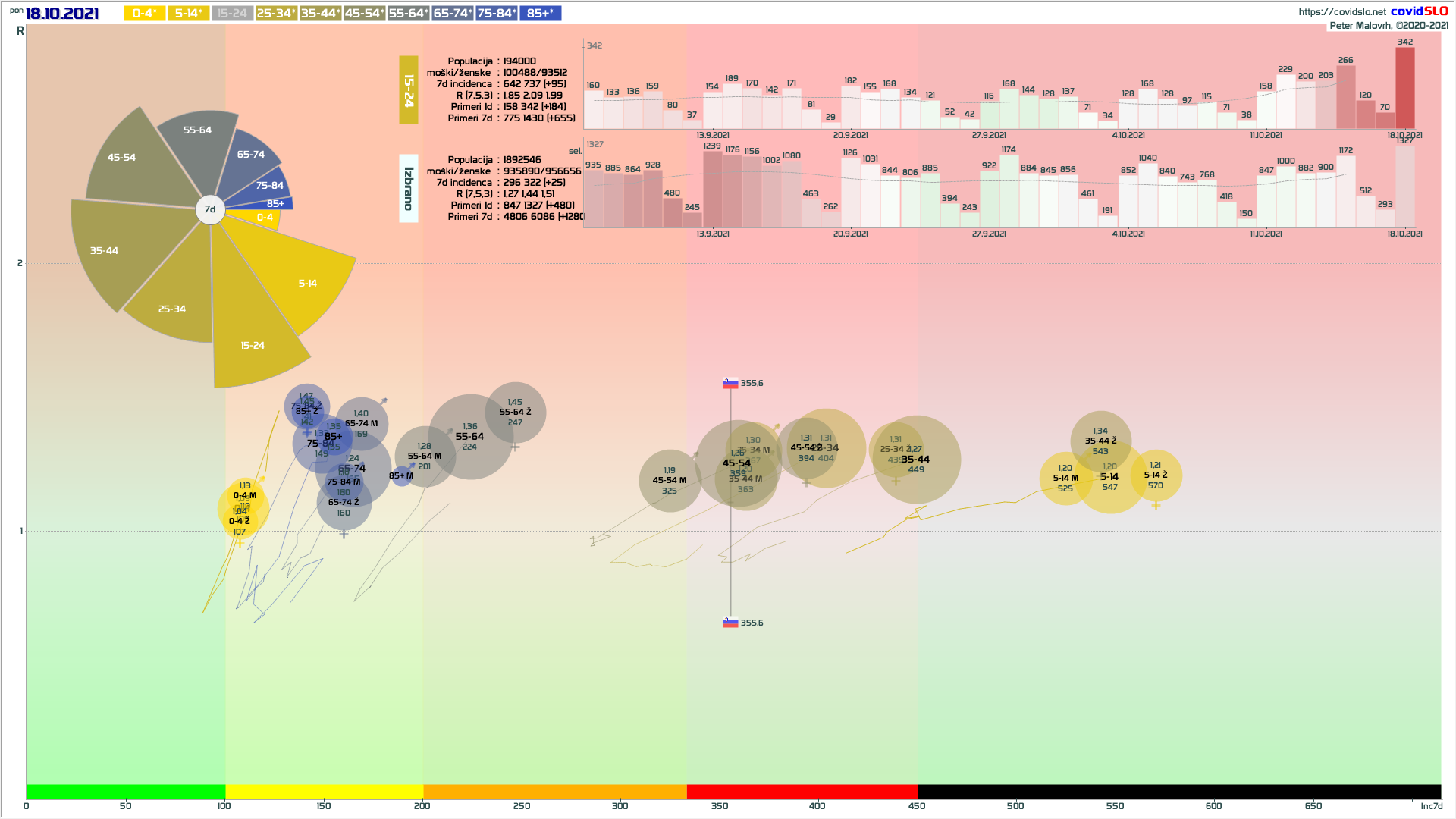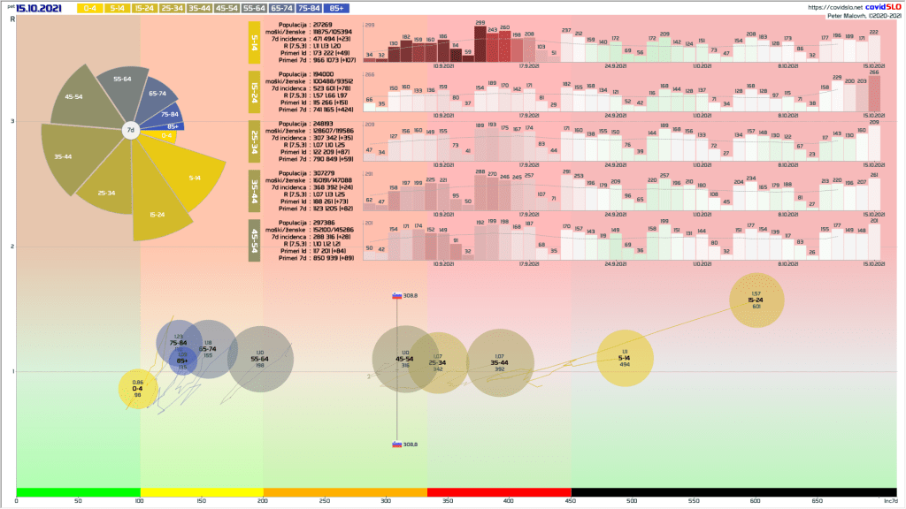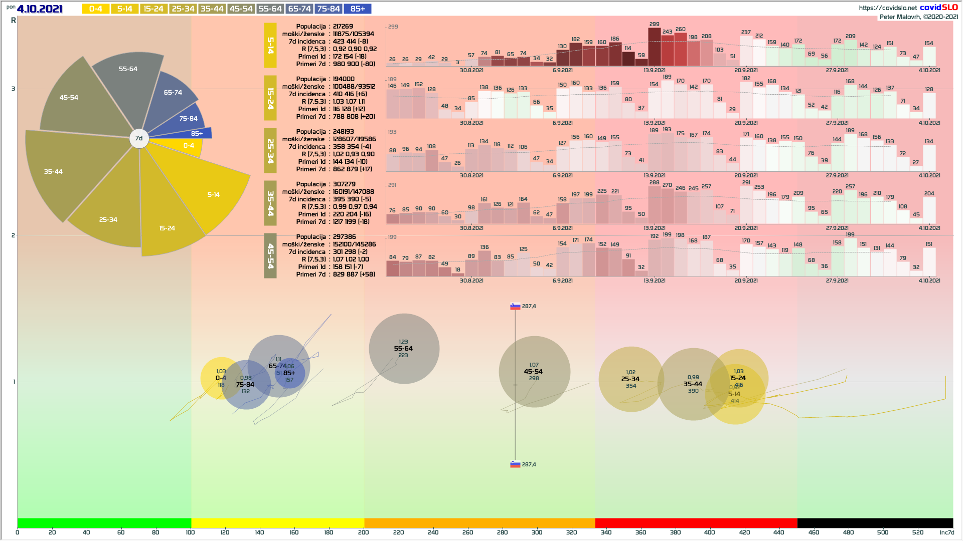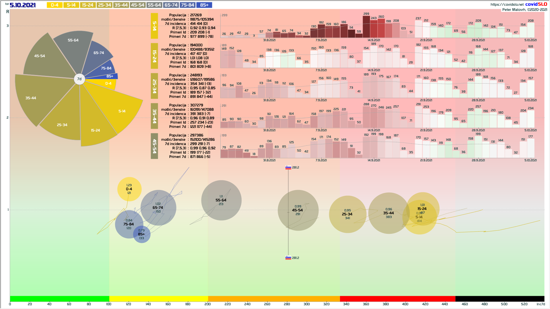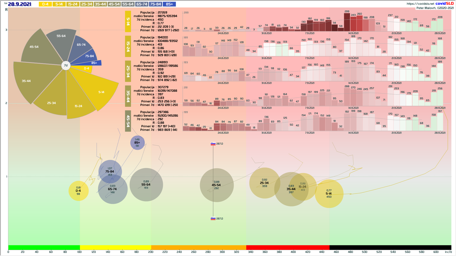 Konec avgusta in v začetku septembra po pričakovanju beležimo padanje incidence v 15-24 (konec počitniškega rajanja doma, v tujini in povsod), ter močno rast incidence v 5-14, ki se poleti ni veliko testirala, zdaj pa se in se je zato pokazala bolj realna slika. Skupina 5-14 let je po incidenci sedaj že prehitela skupino 15-24 let. Incidence rastejo tudi v ostalih mlajših skupinah, zaradi služb in pač dodatnega testiranja. Rast v skupini 5-14 let se je sedaj že umirila in zdaj bomo kmalu videli dejansko stanje reprodukcijskega faktorja R.