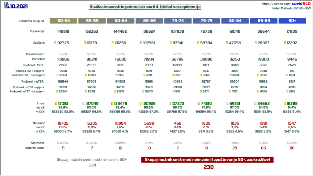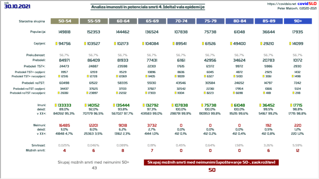 Potencial smrti našega 4. vala že precej časa ocenjujem na okoli dobrih 500 (recimo temu osnovni potencial), a v realnosti bo ta davek med neimunimi (med 65+ jih je bilo 15.9. okoli 30k) verjetno precej nižji, realno okoli 300-400. Zaradi postopnega padanja zaščite od cepljenja pa lahko ta številka naraste tudi na 400 ali več, lahko tudi 500 ali 600. Nekaj se jih bo zdaj v zadnjem trenutku še cepilo, kar bo malce zmanjšalo smrti 4. vala. Pri vsem tem pa predpostavljam dosedanjo prekuženost pri okoli 49%, če je ta nekaj nižja, se potencial iz 500 poviša za 100 na vsakih 5% nižje prekuženosti. Predpostavlja se tudi, da se bo v 4. valu okužilo podoben delež neimunih, kot se je v dosedanjih valovih skupaj. Delta bi sicer zaradi svoje višje virulentnosti lahko našla večji delež neimunih, a po drugi strani so ljudje z največ stiki do sedaj že večinoma prekuženi. Če bi jih delta recimo našla 75%, bi se osnovni potencial smrti iz 500 povišal na 850. Če poskušam upoštevati vse to, bi bila moja trenutna skupna ocena smrti v 4. (delta) valu nekje 500-700. Model trenutno kaže na okoli 730 smrti v 4. valu, a ima v osnovi malce podcenjen tempo cepljenja. Ostajam pri oceni 500-700.
