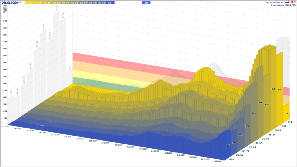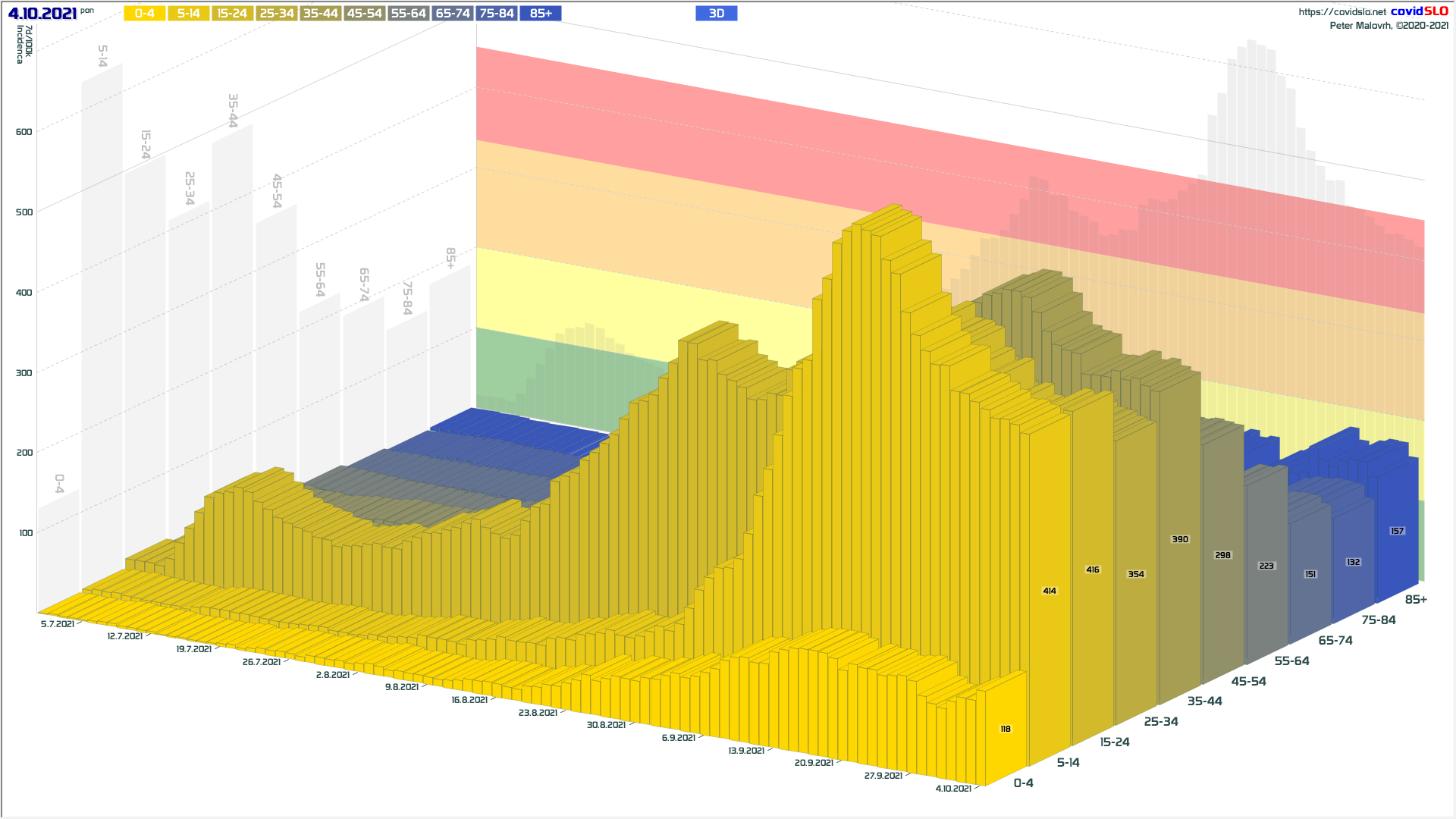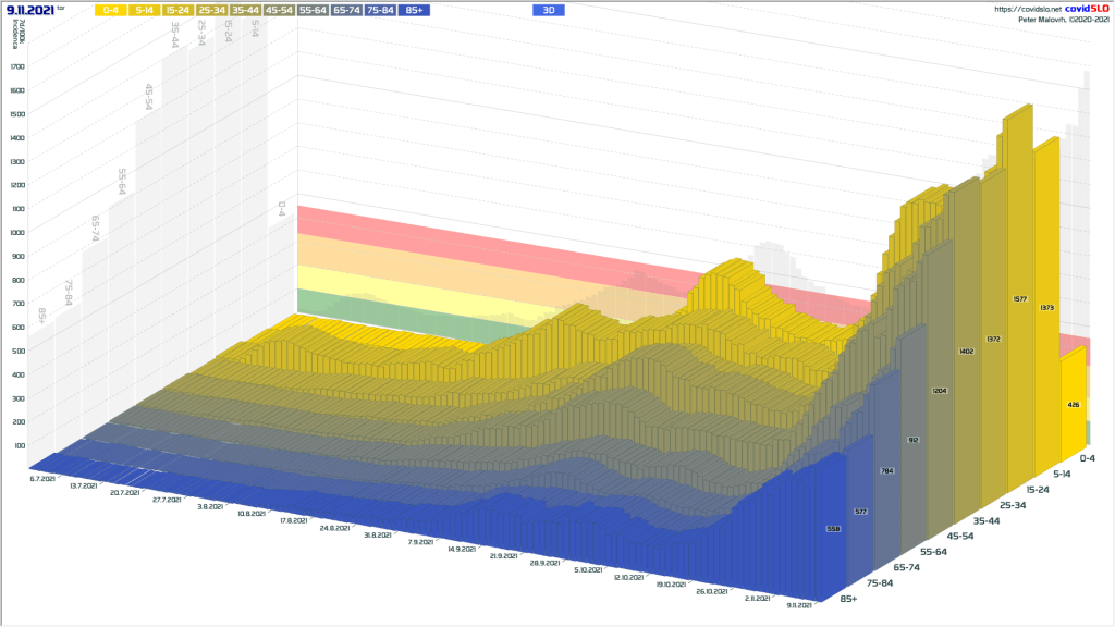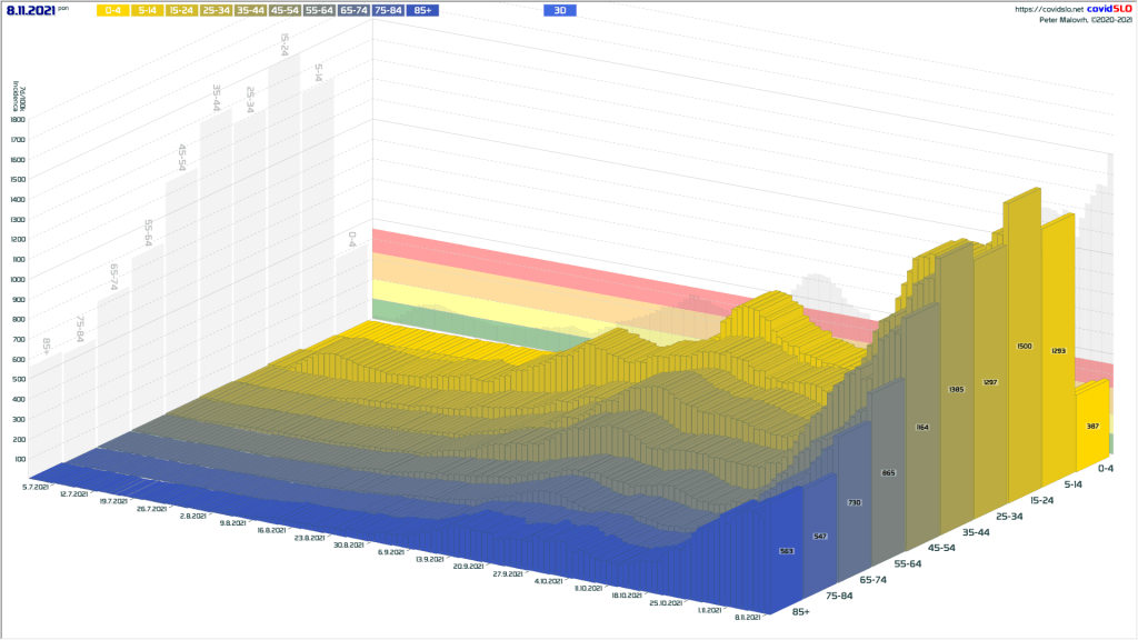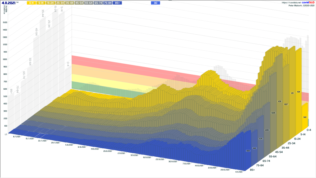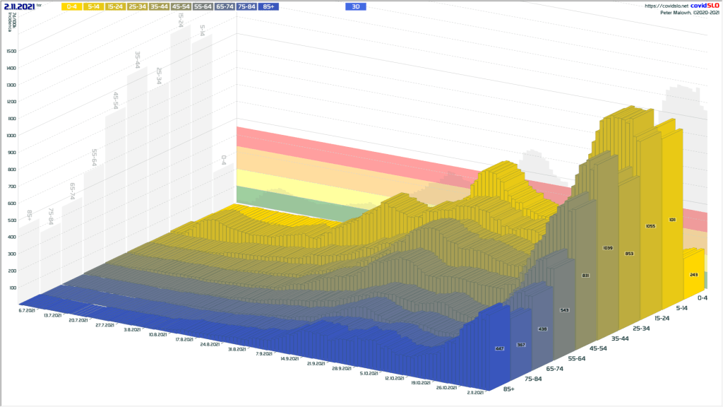 Zdaj se bo zaradi rasti epidemije dvignilo tudi dnevno število umrlih. Predvidevam, da na nekje največ do povprečnega nivoja 15-20/dan, zaradi težkih razmer v bolnišnicah zelo verjetno tudi do 25 ali celo 30. Rizične skupine so zdaj res dobro imunizirane, popušča pa zaščita po cepljenju tistim prvim cepljenim v prvih letošnjih mesecih – teh je baje zato zdaj že kar nekaj v bolnišnicah, čeprav pogled okužbpo starostnih skupinah pokaže, da recimo skupina 85+ ni nič kaj “podivjala”. Kar nekaj je tudi imunsko oslabljenih bolnikov.