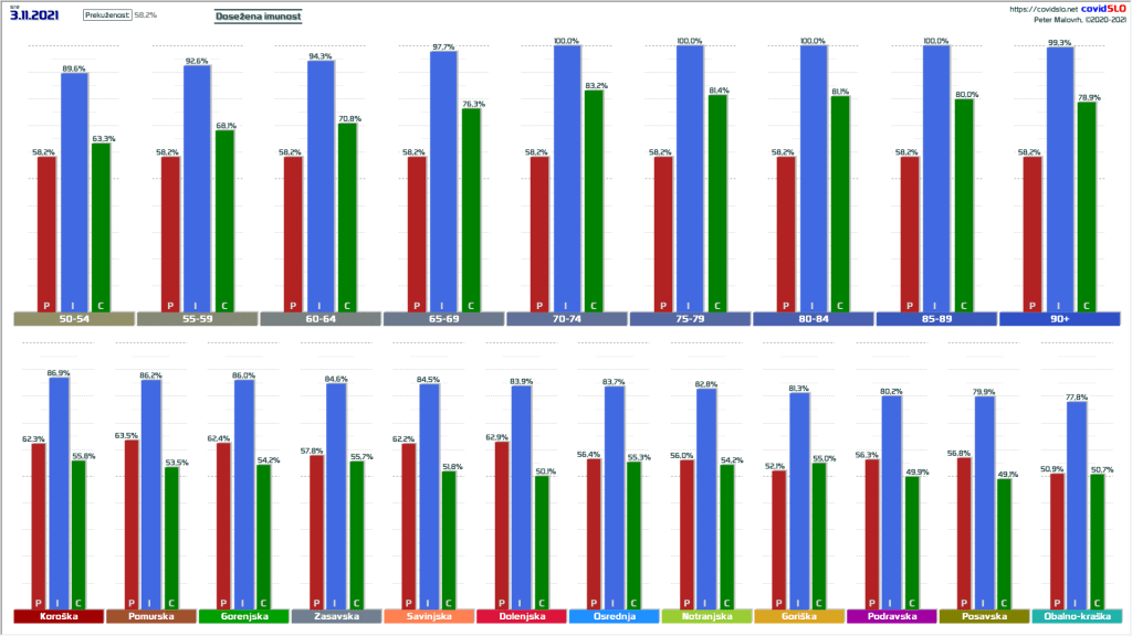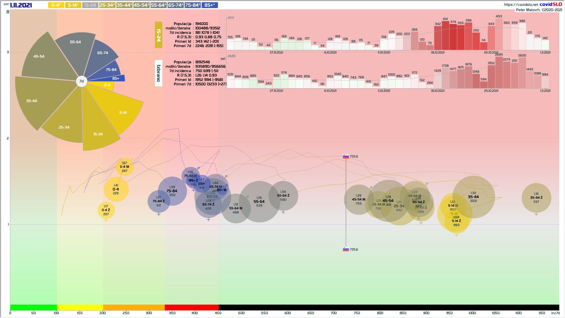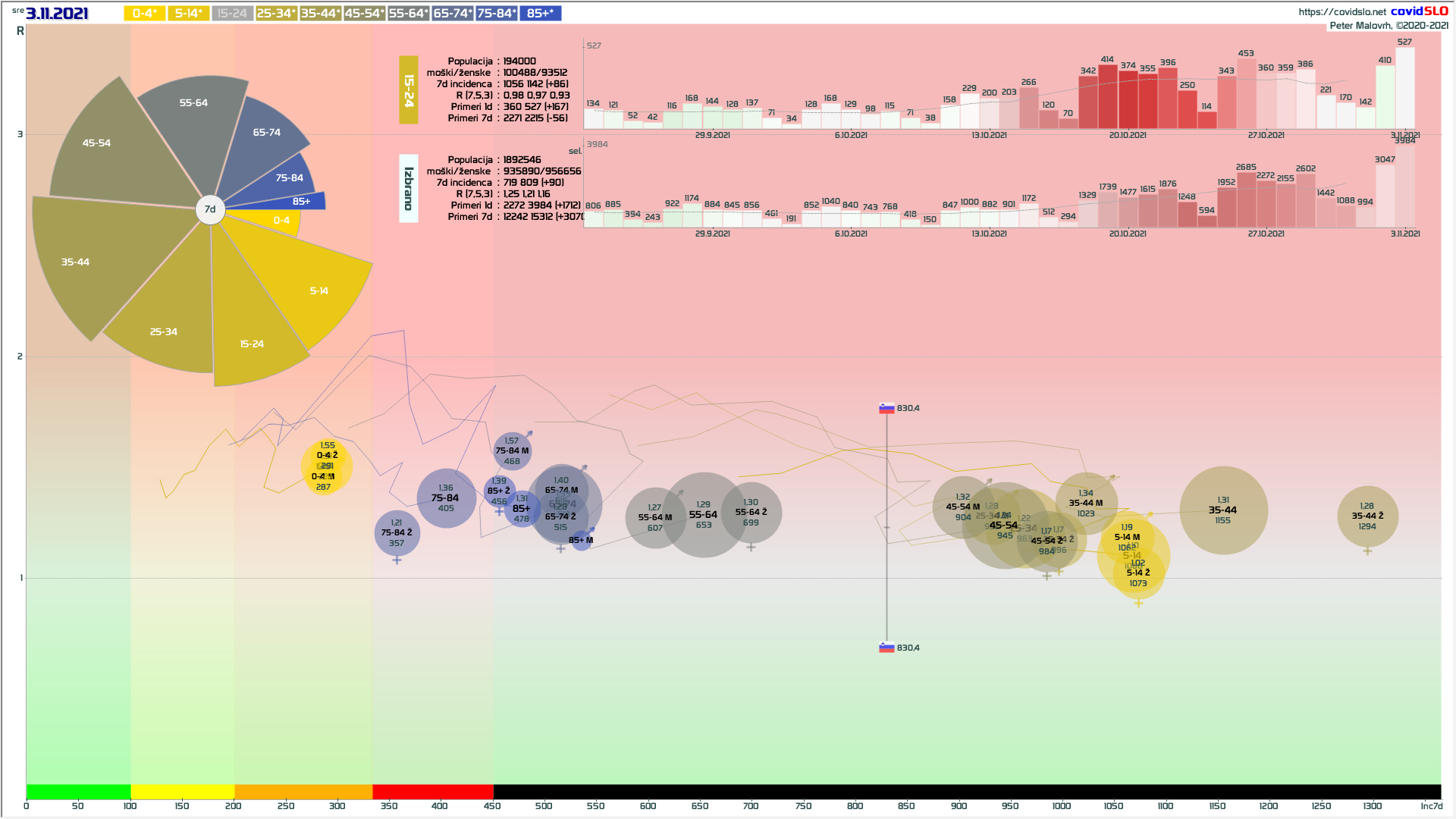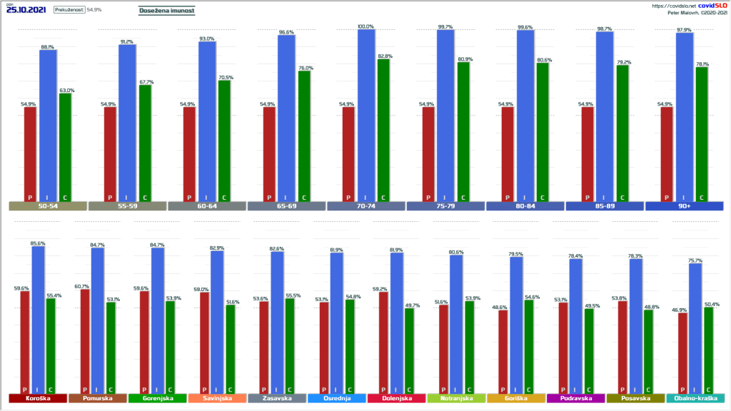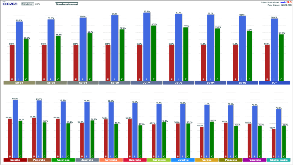 Zdaj se bo zaradi rasti epidemije dvignilo tudi dnevno število umrlih. Predvidevam, da na nekje največ do povprečnega nivoja 15-20/dan, zaradi težkih razmer v bolnišnicah zelo verjetno tudi do 25 ali celo 30. Rizične skupine so zdaj res dobro imunizirane, popušča pa zaščita po cepljenju tistim prvim cepljenim v prvih letošnjih mesecih – teh je baje zato zdaj že kar nekaj v bolnišnicah, čeprav pogled okužbpo starostnih skupinah pokaže, da recimo skupina 85+ ni nič kaj “podivjala”. Kar nekaj je tudi imunsko oslabljenih bolnikov.