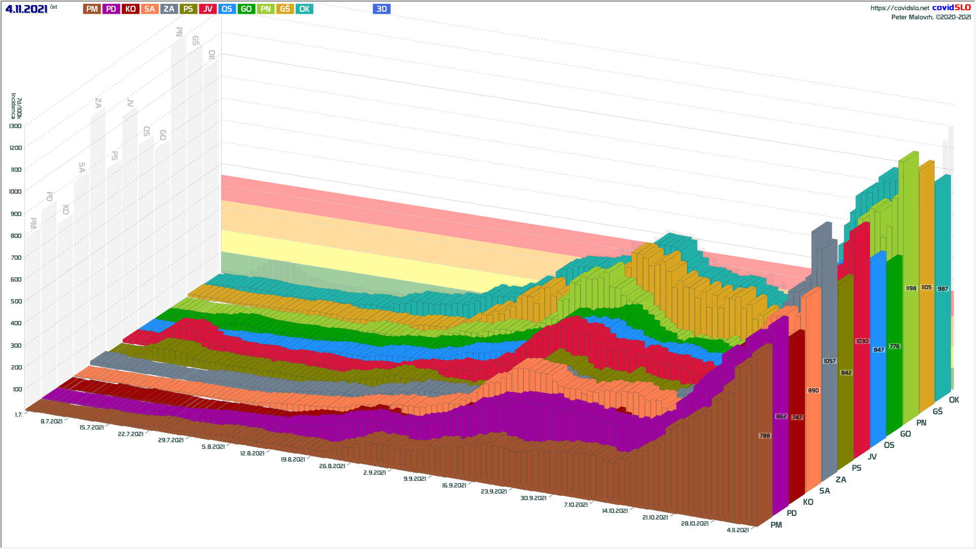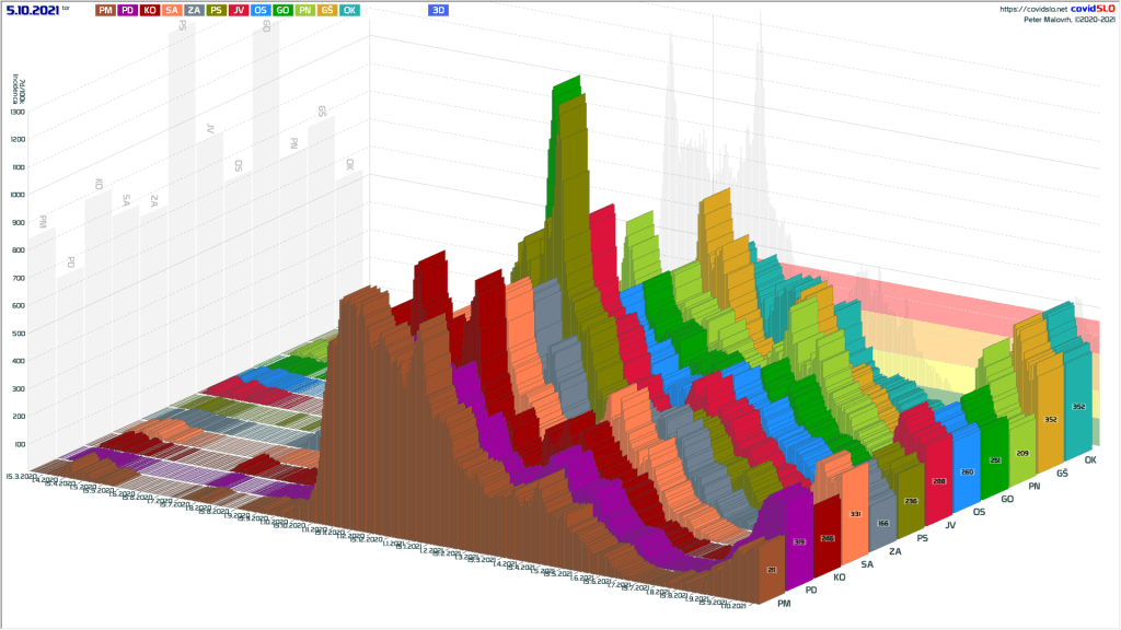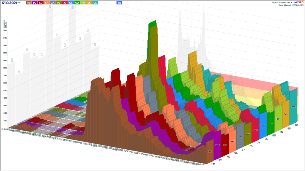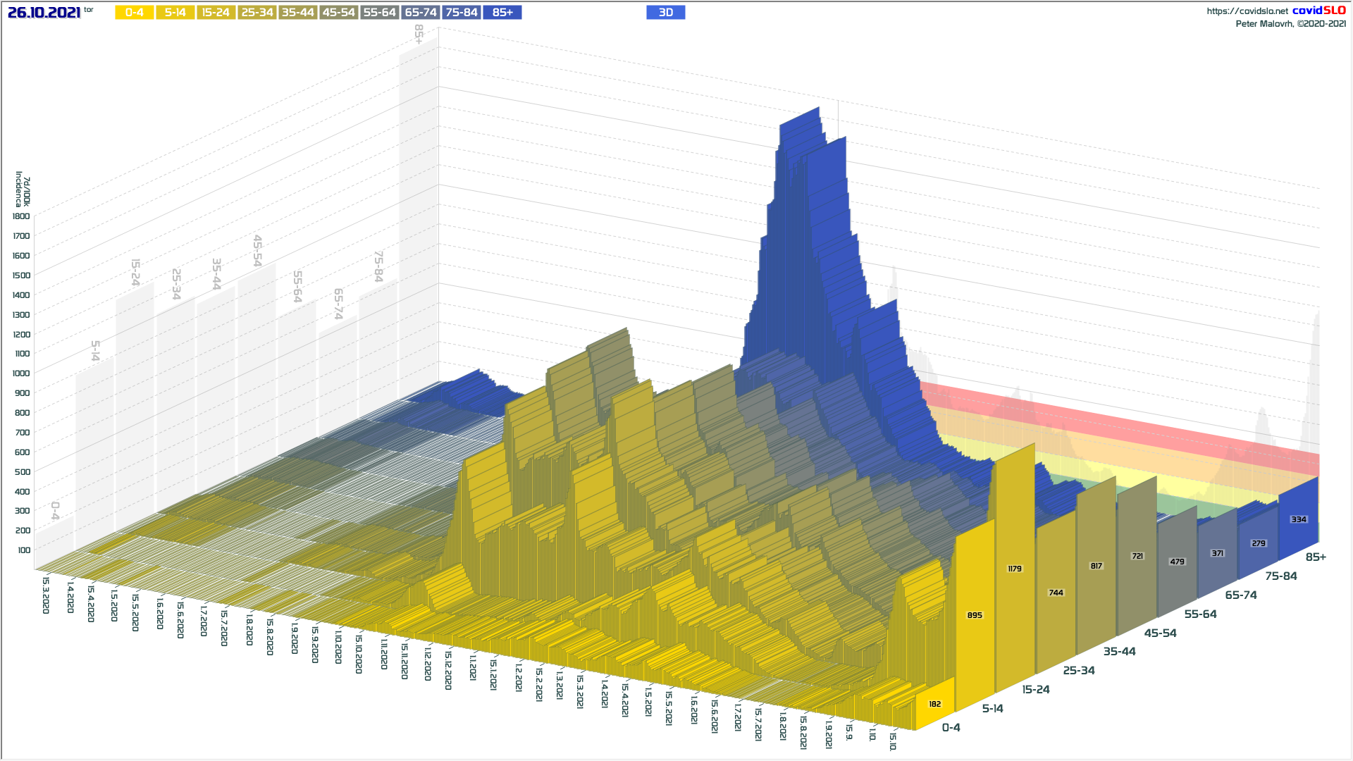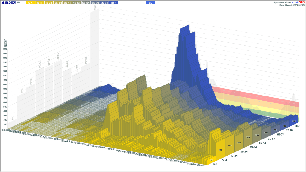 Zaradi rasti epidemije se zdaj dviguje tudi dnevno število umrlih. Predvidevam, da na nekje največ do povprečnega nivoja 15-20/dan, zaradi težkih razmer v bolnišnicah zelo verjetno tudi do 25 ali celo 30. Rizične skupine so zdaj res dobro imunizirane, popušča pa zaščita po cepljenju tistim prvim cepljenim v prvih letošnjih mesecih – teh je baje zato zdaj že kar nekaj v bolnišnicah, čeprav pogled okužb po starostnih skupinah pokaže, da recimo skupina 85+ ni nič kaj “podivjala”. Kar nekaj je tudi imunsko oslabljenih bolnikov.