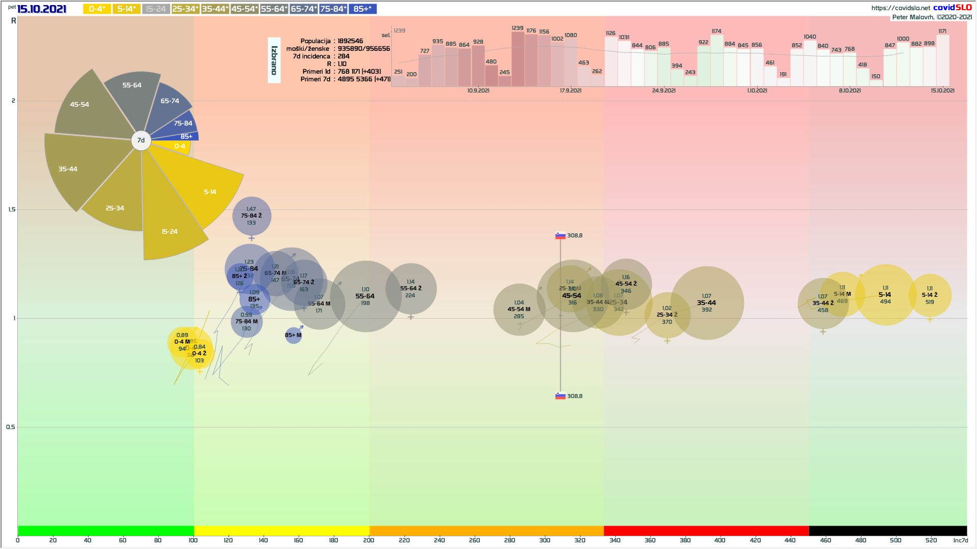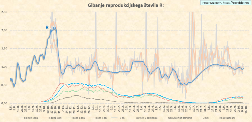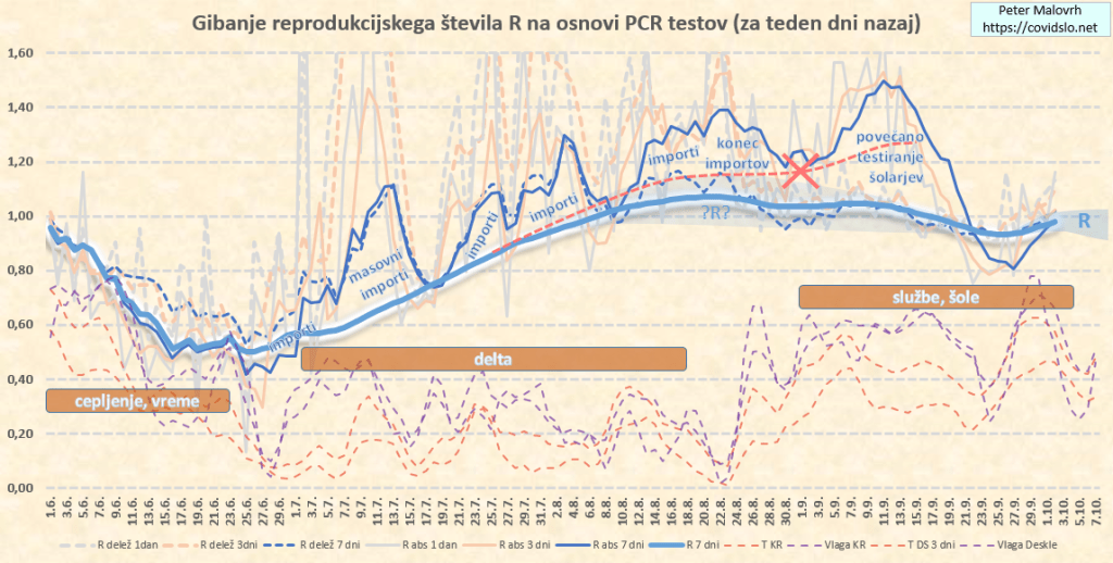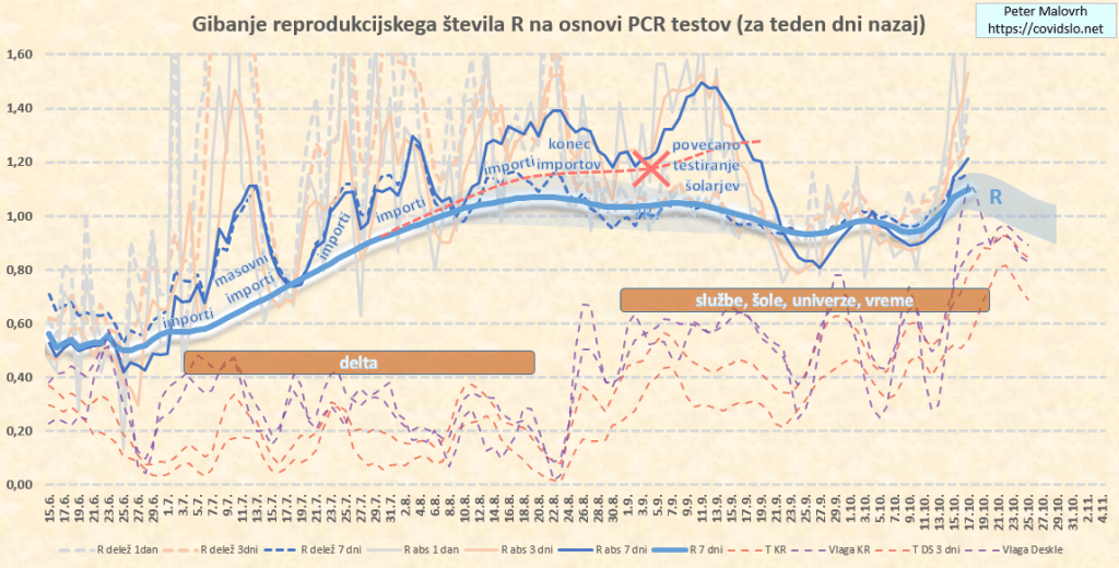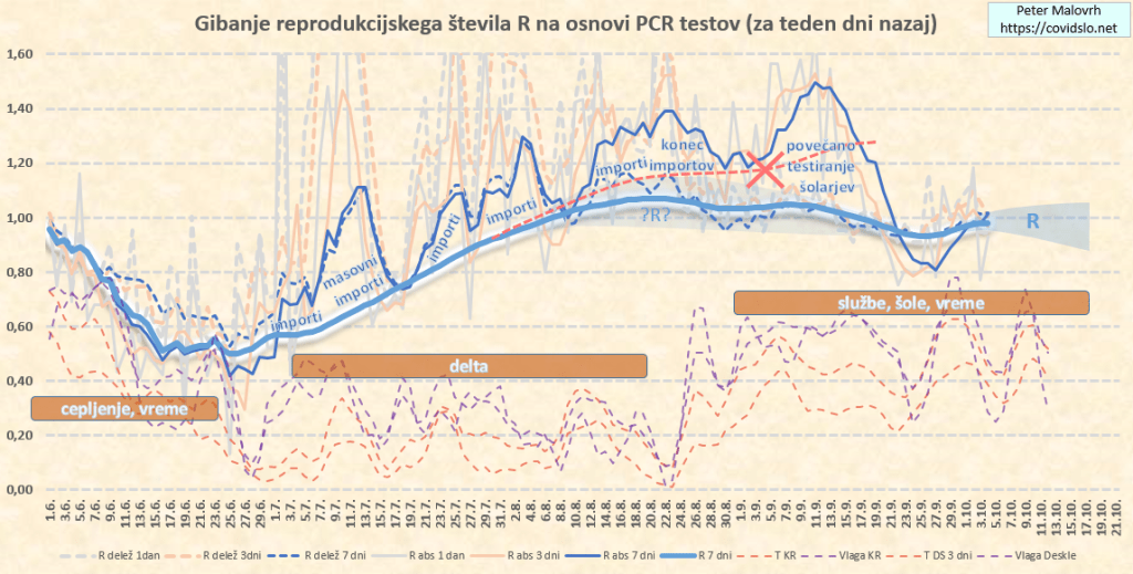 Ocenjujem (za teden dni nazaj) R=1.10 Proces povečevanja R zaradi delte je že nekaj časa končan. Zdaj ga višajo službe in šole, malenkost tudi vreme (pri delti ima vreme zelo majhen vpliv). Učenci se bolj testirajo, zato zdaj vse bolj normalna incidenca v skupini 5-14 let, ki je bila prej nerealno nizka zaradi netestiranja. Izračunani R je tako sredi septembra vleklo previsoko, zdaj pa ga bo nekaj časa prenizko. Pravi R je vrjetno nekje med 1.00 in 1.15. , pokazal se bo po 25.9. Vpliv šol bo na številke še veliko bolj opazen po 25.9.