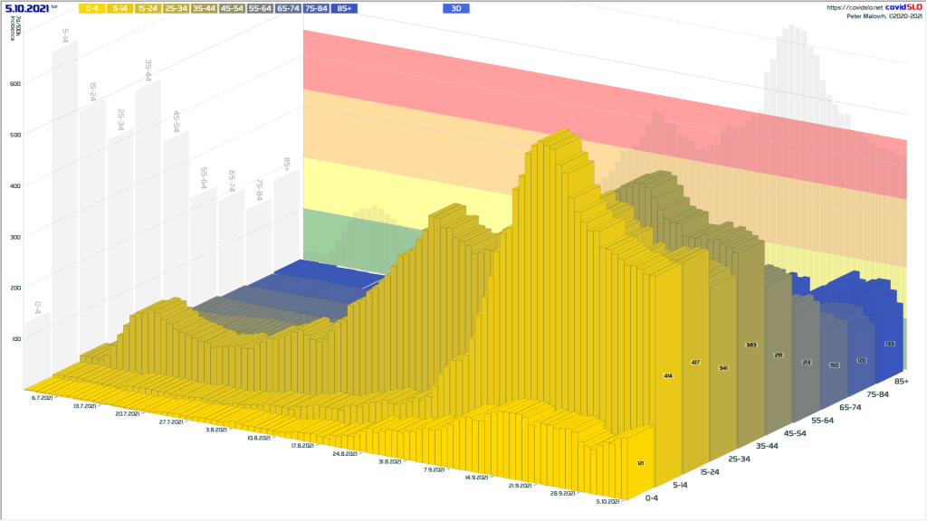Zaradi rasti epidemije se zdaj dviguje tudi dnevno število umrlih. Predvidevam, da na nekje največ do povprečnega nivoja 20-30/dan, zaradi težkih razmer v bolnišnicah zelo verjetno lahko tudi nekaj čez. Rizične skupine so zdaj res dobro imunizirane, popušča pa zaščita po cepljenju tistim prvim cepljenim v prvih letošnjih mesecih – teh je baje zato zdaj že kar nekaj v bolnišnicah, čeprav pogled okužb po starostnih skupinah pokaže, da recimo skupina 85+ ni nič kaj “podivjala”. Kar nekaj je tudi imunsko oslabljenih bolnikov.