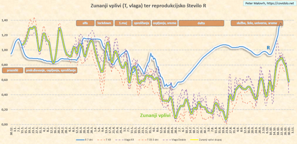 R=1.10, vreme/šole/službe/univerze ga povečujejo, sprotna imunizacja deluje v nasprotno smer