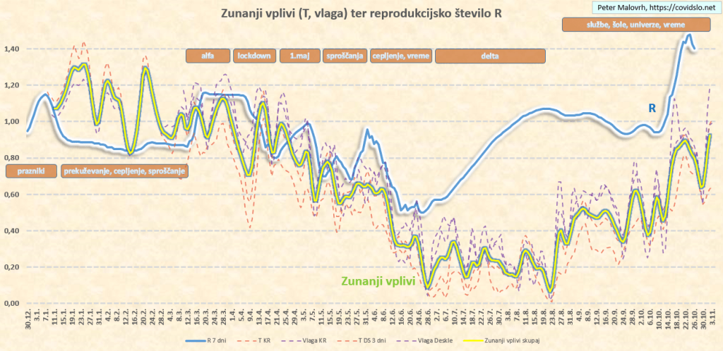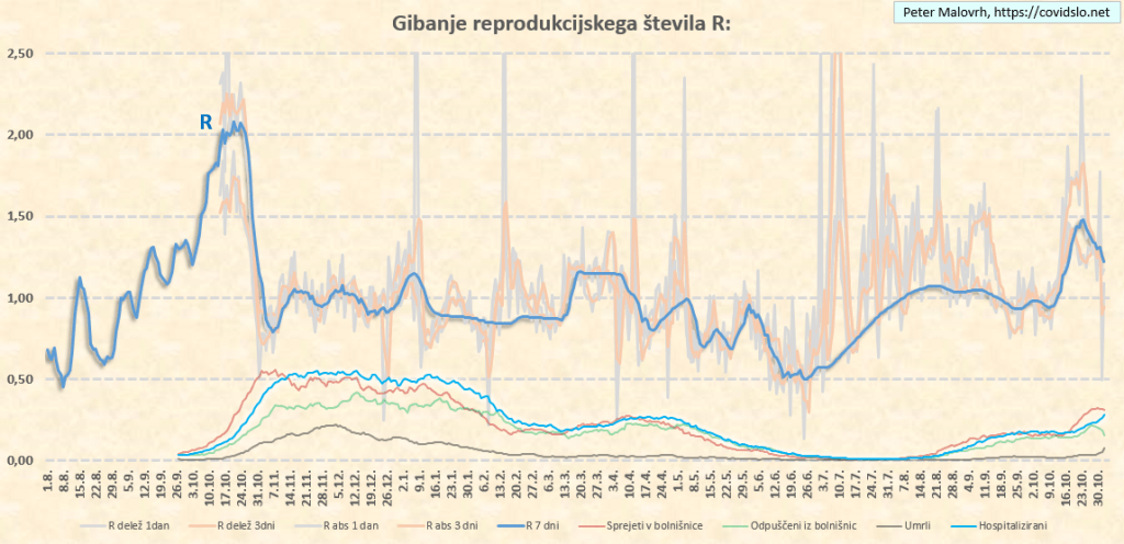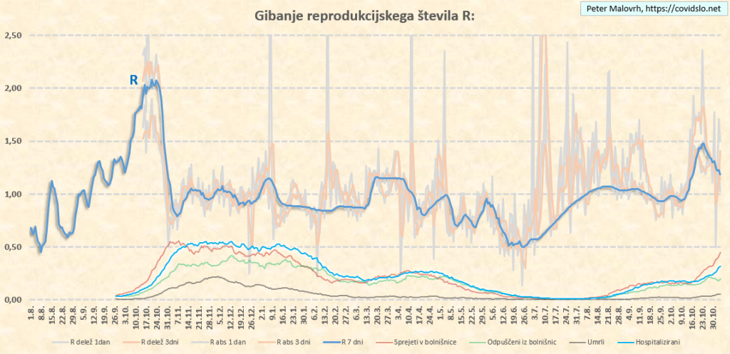 V oktobru je bilo sicer pričakovati postopen dvig R proti 1.4. A pospešen tempo cepljenja pomeni še večjo sprotno imunizacijo, ki še hitreje sproti znižuje R, kot ga razmere, službe in šole dvigujejo. Tako da zdaj bolj kaže, da se morda dvigne do 1.20-1.25, kaj več pa ne.