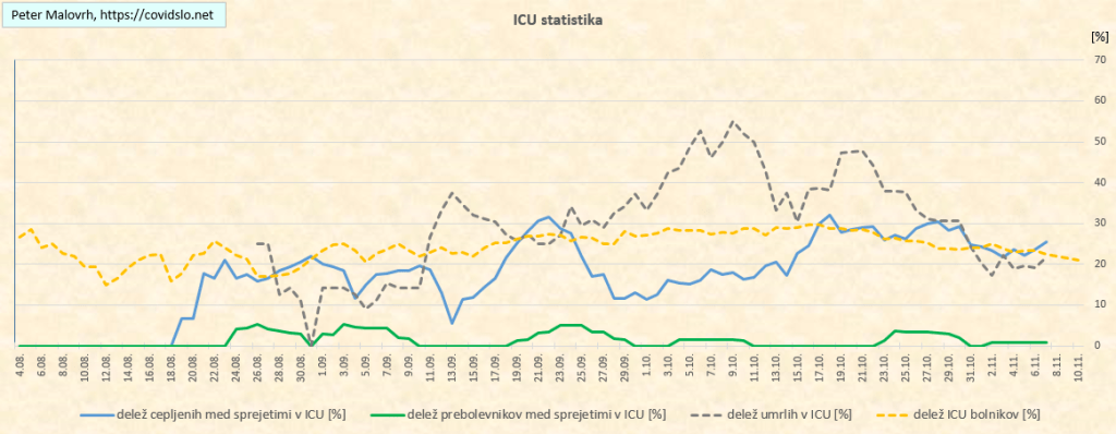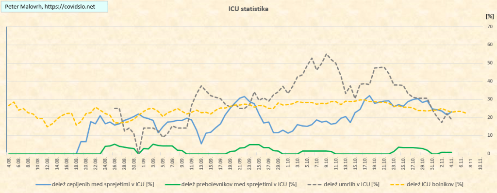 Povprečno dnevno število umrlih je bilo po prvem vrhu pri 6.5/dan v zadnjem tednu septembra in v prvem tednu oktobra okoli 5/dan, potem pa v drugem tednu oktobra celo 3.5/dan. Nato je še pred pričetkom ponovne rasti sprejemov pričelo naraščati in zdaj se bližamo že povprečju 9/dan. Vzrok za tak porast ni jasen, verjetno gre za neko statistično prekladanje podatkov med NIJZ in MZ, ali pa morda za preventivno čuvanje ICU postelj (delež ICU pada), ne vem.