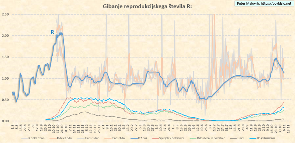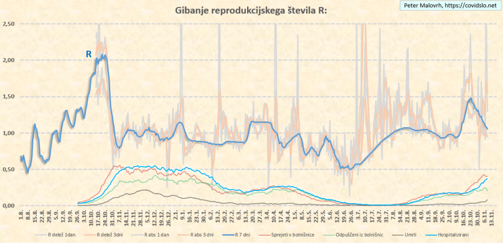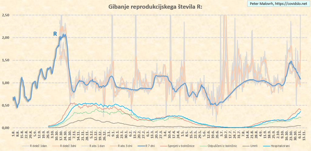 Tempo rasti se upočasnjuje, R pada. Vprašanje je, do kam in v kolikšnem času bo uspel pasti. Če pade pod 1, bomo imeli padajočo epidemijo. Upanje, da bi se to lahko zgodilo proti koncu tega tedna, in bi potem imeli padanje okužb, je žal izpuhtelo. Kot sem rekel, itak nisem bil prevelik optimist glede tega. Vrh okužb se sedaj kaže v drugem tednu novembra.
