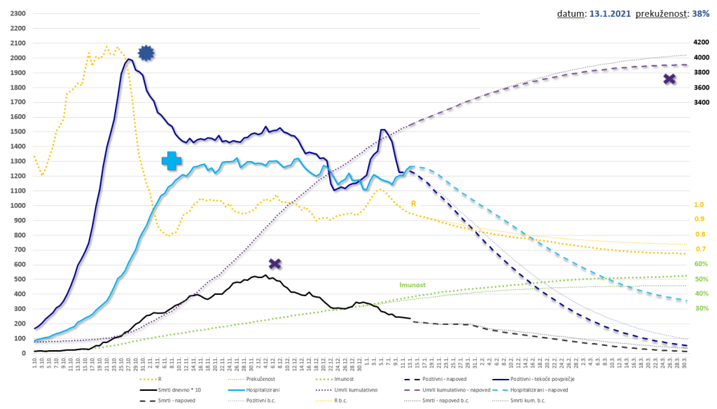 - Na dan 14.1.2021 štartamo z R=0.95 in z 38% prekuženostjo prebivalstva. Ti oceni sta rezultat sprotnih dnevnih analiz epidemije v Sloveniji. Če je R v resnici morda malce višji, prekuženost pa nekaj nižja, bo vseh smrti nekaj več, v obratnem primeru pa nekaj manj.