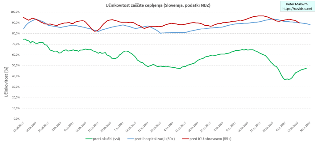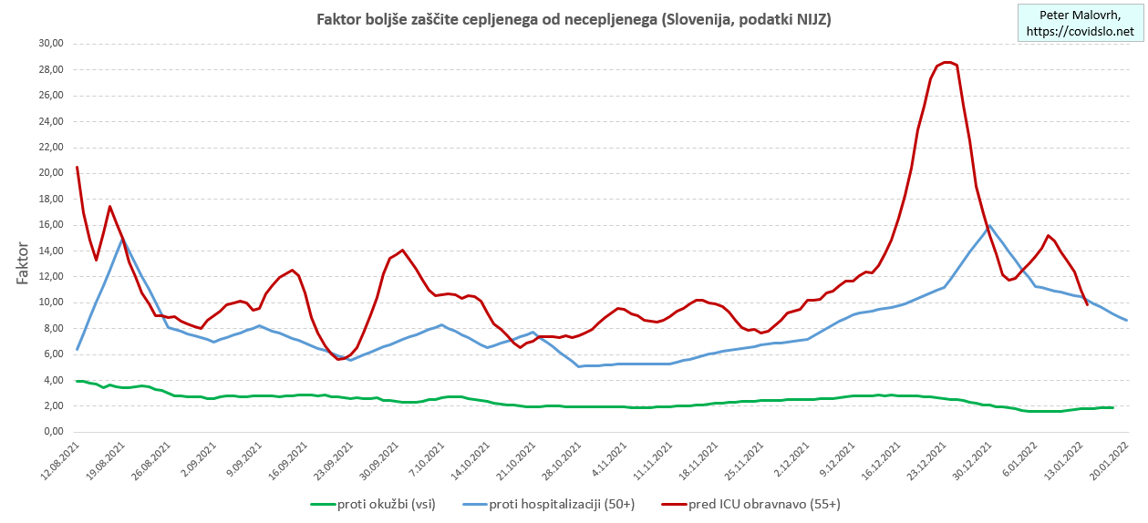 Učinkovitost zaščite po uspešnem cepljenju s časom upada. To se prične poznati pri pojavljanju t.i. prebojnih okužb (cepljeni se vseeno okuži), kasneje pa tudi že kot sprejemanje okuženih cepljenih v bolnišnice. Iz podatkov o okužbah, bolnišničnih sprejemih ter sprejemih v enote intenzivne terapije EIT/EIZ/ICU, vse to po cepilnem statusu, je možno izluščiti povprečne faktorje, kolikrat bolje so v nekem momentu cepljeni bolje zaščiteni od necepljenih.